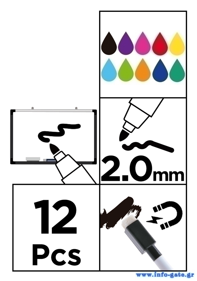 Σετ 12 χρωματιστοί μαρκαδόροι, με πάχος 2mm, ιδανικοί για χρήση σε ασπροπίνακες.