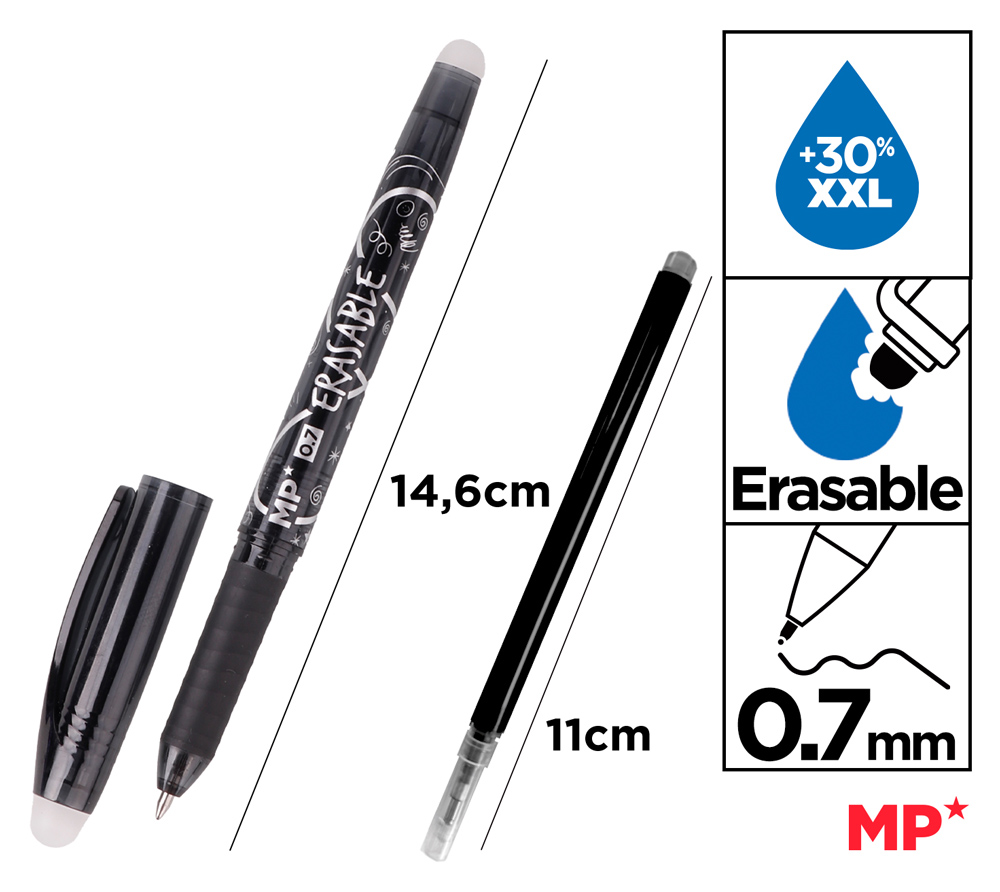 Στυλό διαρκείας της MP με μελάνι που σβήνει μέσω της ειδικής γόμας που διαθέτει. Διαθέτει καπάκι με κλιπ για να ασφαλίζει στις τσέπες των ρούχων και στα τετράδια.