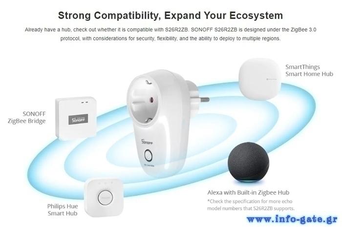 Υποστηρίζει πρωτόκολλο σύνδεσης ZigBee 3.0 και είναι συμβατό με τα Hubs Sonoff ZigBee Bridge, Philips Hue smart Hub, Amazon Alexa Echo Speaker και Samsung SmartThings Hub.