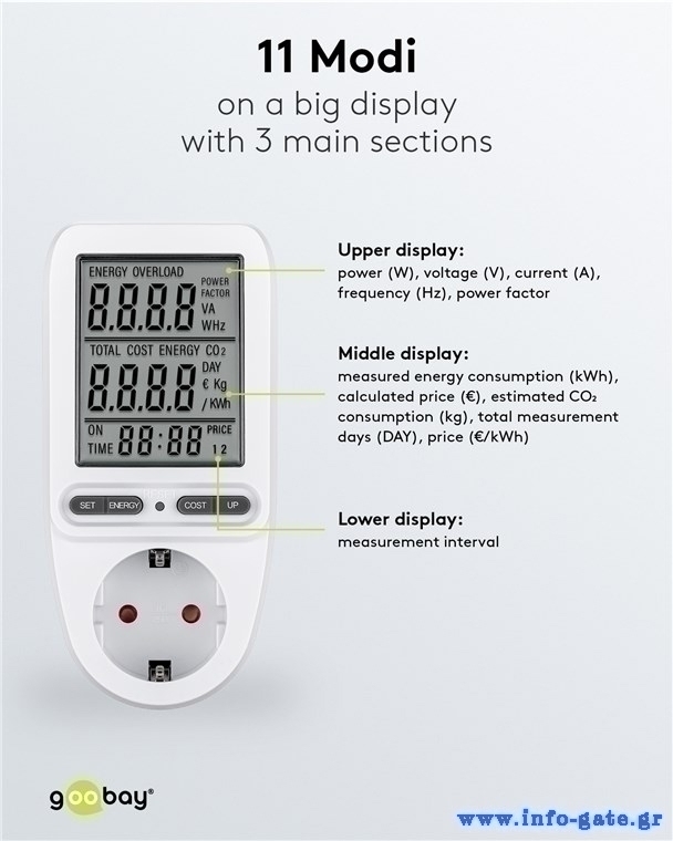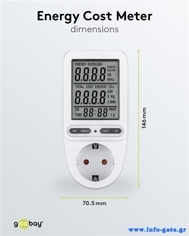 Μετρητής της Goobay για τη μέτρηση της κατανάλωσης ρεύματος των συνδεδεμένων οικιακών ηλεκτρικών συσκευών. Ενσωματώνει ευανάγνωστη οθόνη που σας επιτρέπει να παρακολουθείτε την κατανάλωση του ρεύματος κόστος σε ευρώ/kWh αλλά και τον χρόνο κατανάλωσης. Τα δεδομένα μπορούν να αποθηκευτούν για έως 20 λεπτά μετά την αποσύνδεση της συσκευής, επιτρέποντας σας την εναλλαγή διαφορετικών ηλεκτρικών συσκευών χωρίς να χάσετε τα δεδομένα.