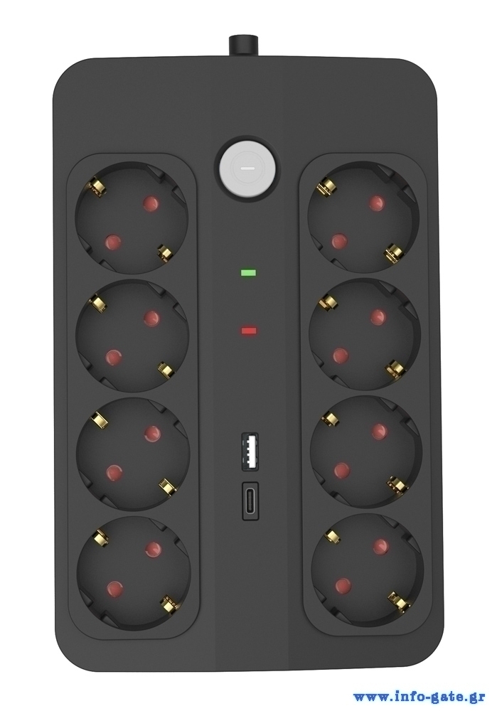 Προστασία από αιφνίδιες αυξομειώσεις τάσης και υπερτάσεις ρεύματος, όπως αυτές που προκαλούνται από κεραυνούς ή προβλήματα του δικτύου. Εξασφαλίζει μεγαλύτερη διάρκεια ζωής και ασφαλή λειτουργία των ηλεκτρονικών σας συσκευών.
