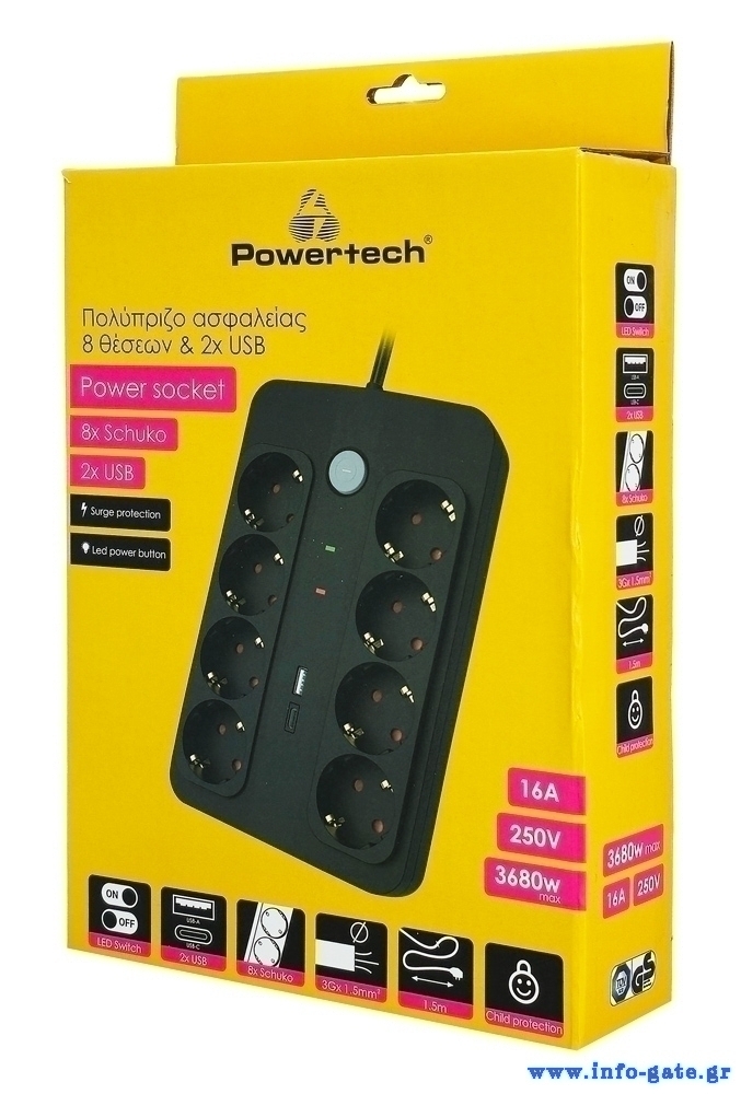 POWERTECH πολύπριζο ασφαλείας PT-1535, 8 θέσεων, με USB & USB-C θύρες, 16A, 1.5m, μαύρο