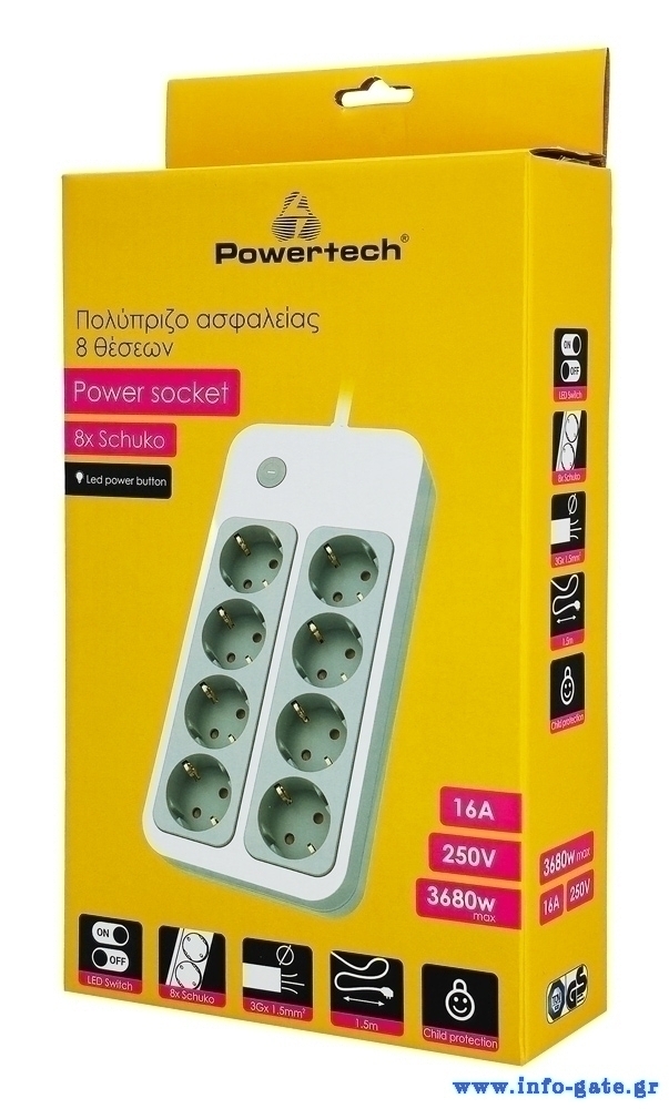 POWERTECH πολύπριζο ασφαλείας PT-1534, 8 θέσεων, 16A, 1.5m, λευκό
