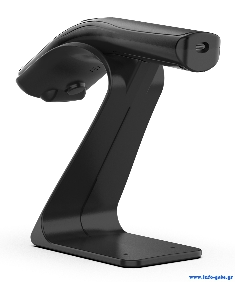 Στη συσκευασία συμπεριλαμβάνεται βάση για την στήριξη του barcode scanner και USB dongle για την ασύρματη σύνδεση του.