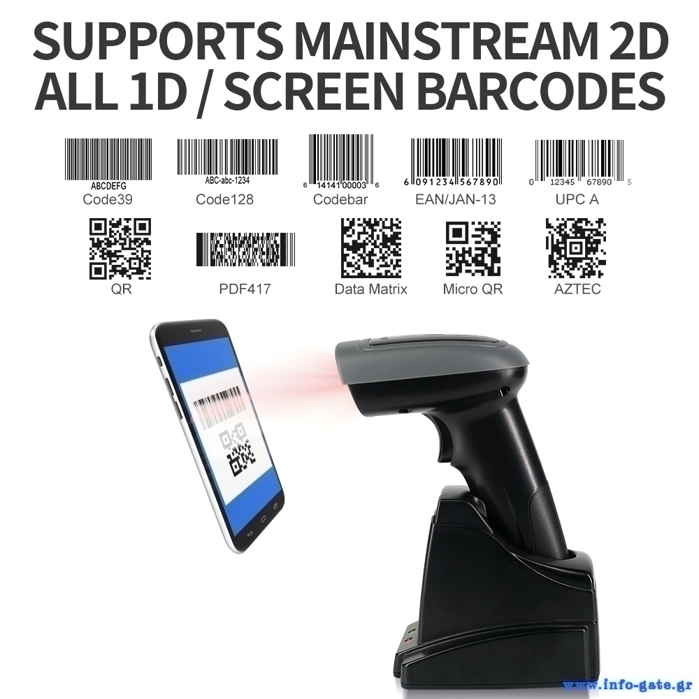 Στη συσκευασία συμπεριλαμβάνεται βάση για την φόρτιση, στήριξη και ασύρματη σύνδεση του barcode scanner.