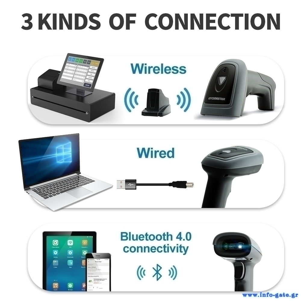 Barcode scanner της GTCODESTAR για γρήγορη και ακριβή ανάγνωση 1D & 2D barcodes. Υποστηρίζει ενσύρματη αλλά και ασύρματη σύνδεση μέσω ζώνης συχνότητας 2.4GHz και Bluetooth.