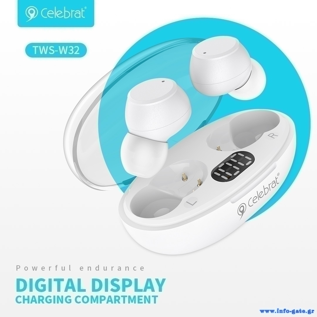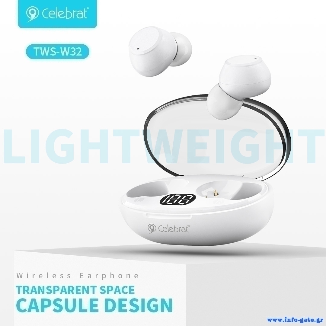 Τα true wireless earphones TWS-W32 της Celebrat προσφέρουν κορυφαία ποιότητα ήχου και άριστη εφαρμογή στο αυτί. Είναι συμβατά με tablets, smartphones και κάθε συσκευή που διαθέτει bluetooth. Διαθέτουν θήκη φόρτισης, για την αποθήκευση, προστασία και επαναφόρτιση των ακουστικών. Η θήκη επαναφορτίζεται από καλώδιο φόρτισης USB-C.