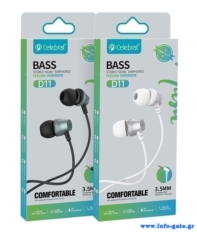 CELEBRAT earphones με μικρόφωνο D11, 3.5mm σύνδεση, Φ10mm, 1.2m, μαύρα