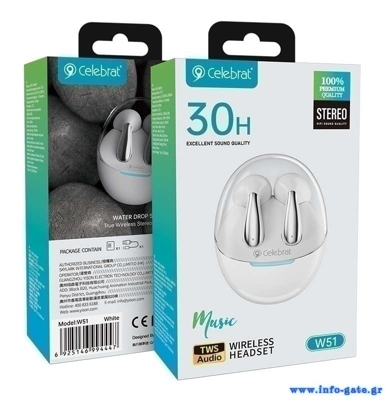 Τα true wireless earphones W51 της Celebrat προσφέρουν κορυφαία ποιότητα ήχου και άριστη εφαρμογή στο αυτί. Είναι συμβατά με tablets, smartphones και άλλες συσκευές που διαθέτουν Bluetooth.