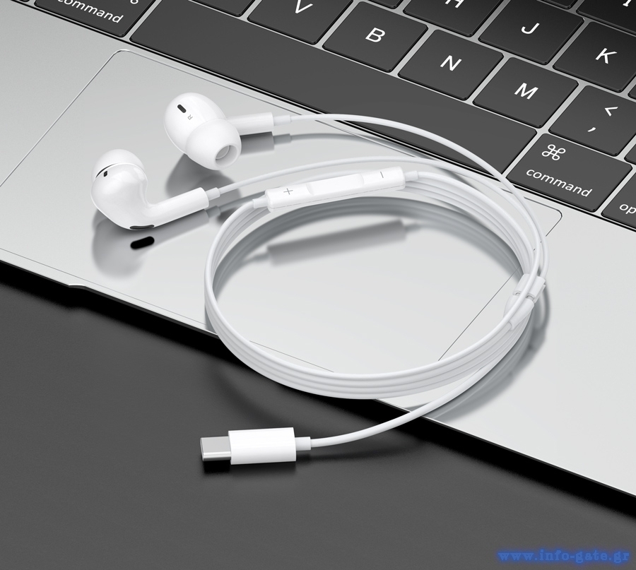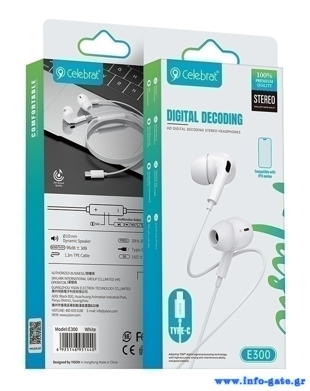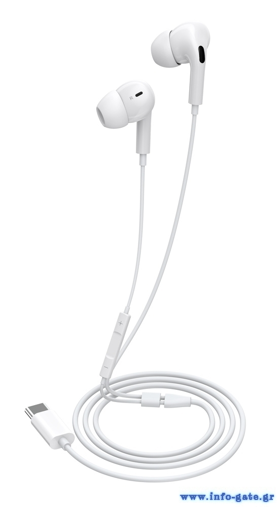 CELEBRAT earphones με μικρόφωνο E300, USB-C σύνδεση, Φ10mm, 1.2m, λευκά