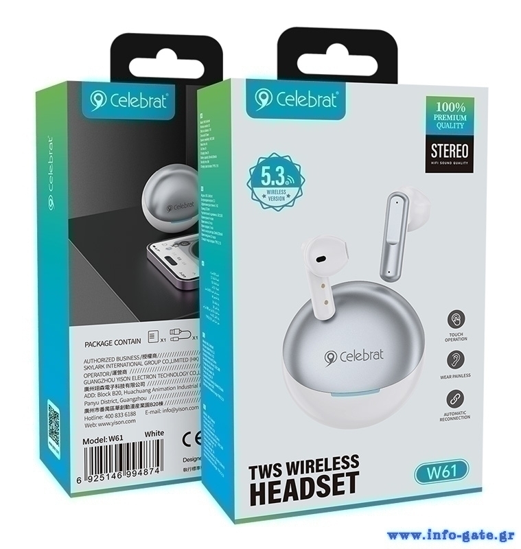Τα true wireless earphones W61 της Celebrat προσφέρουν κορυφαία ποιότητα ήχου και άριστη εφαρμογή στο αυτί. Είναι συμβατά με tablets, smartphones και άλλες συσκευές που διαθέτουν Bluetooth.