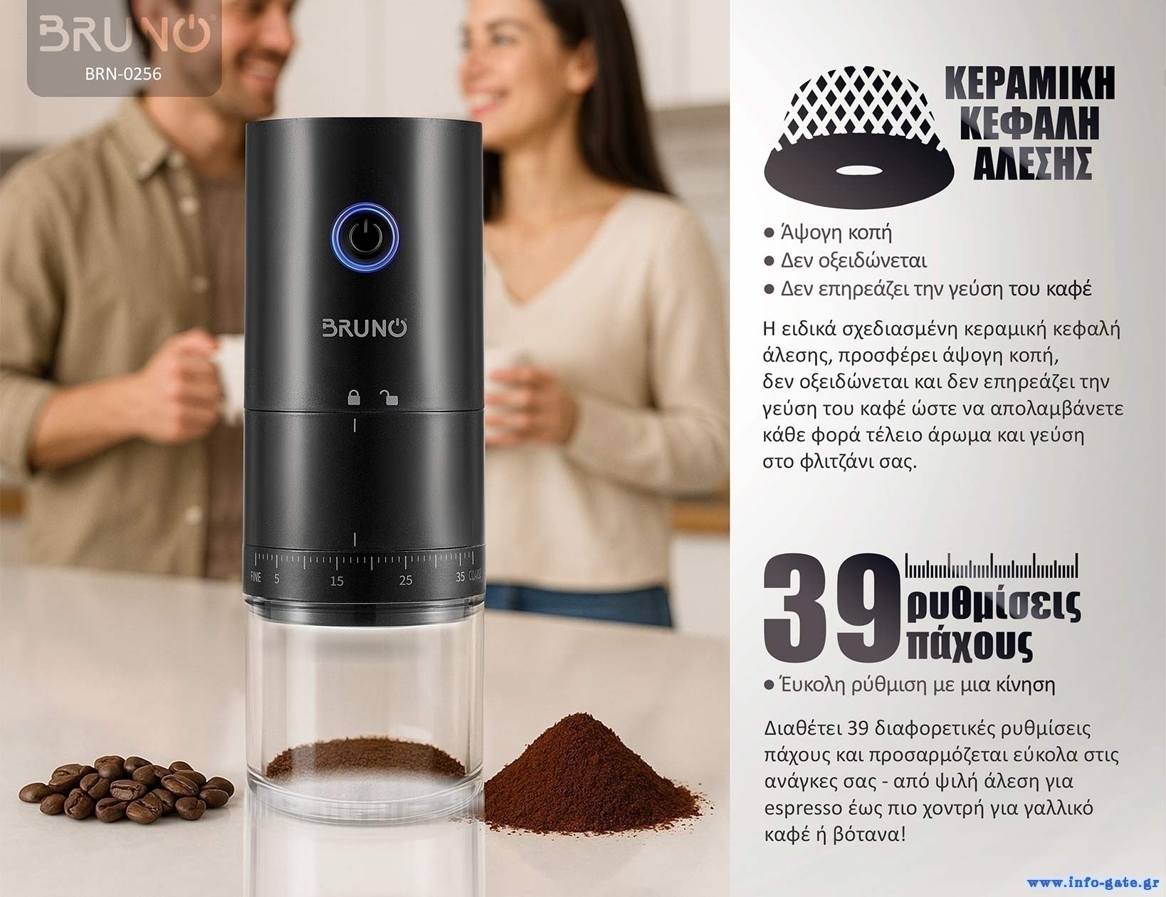Κεφαλή άλεσης: Κεραμική κεφαλή κοπής/άλεσης (=Άψογη κοπή, δεν οξειδώνεται, δεν επηρεάζει την γεύση του καφέ)