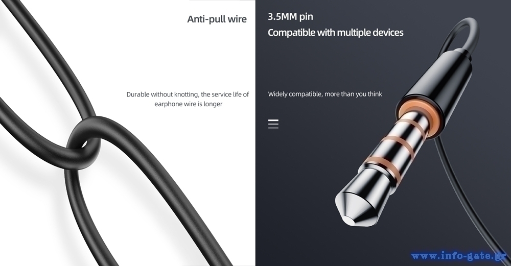 Διαθέτουν μεγάλο καλώδιο μήκους 1.36m και η σύνδεσή τους πραγματοποιείται μέσω υποδοχής 3.5mm.