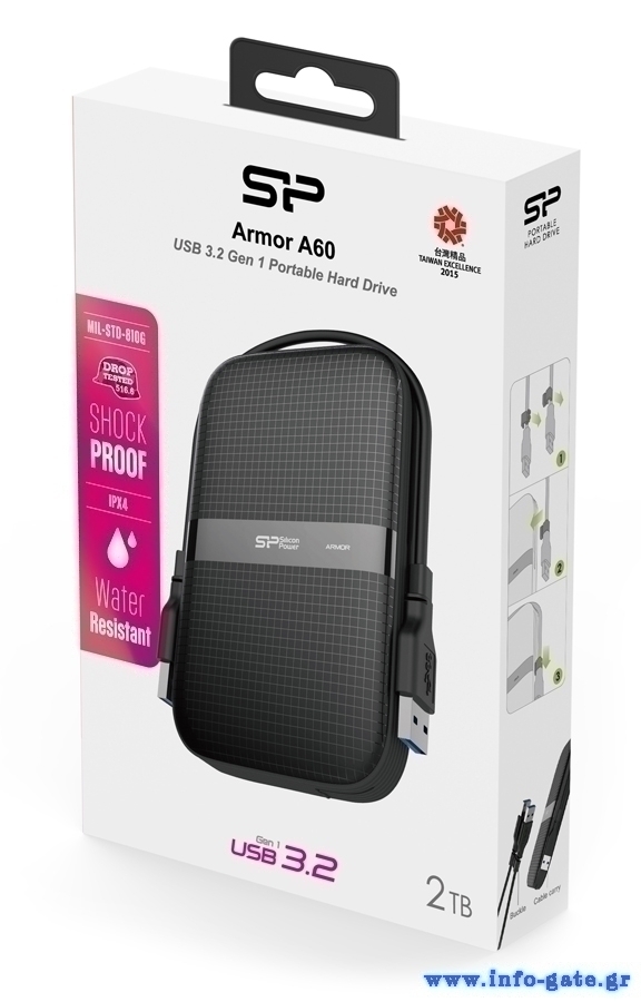 Εξωτερικός σκληρός δίσκος Armor A60 της Silicon Power, εξαιρετικά ανθεκτικός στα χτυπήματα (MIL-STD-810G) και με προστασία IPX4.