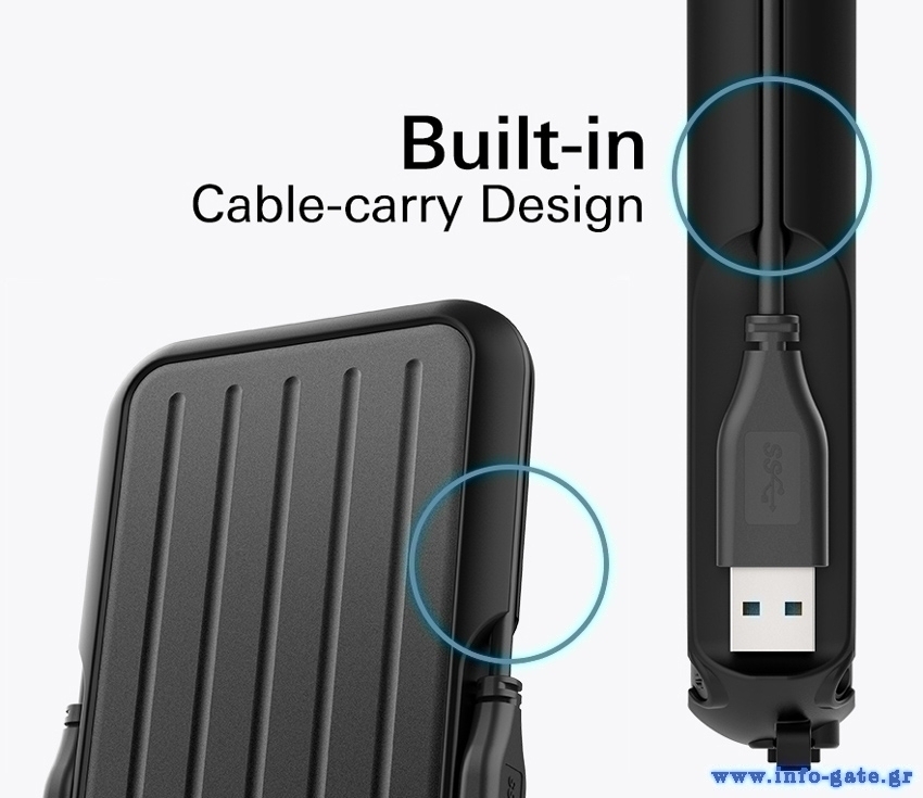 Ο cable-carry σχεδιασμός του, σας επιτρέπει να αποθηκεύετε το καλώδιο σύνδεσης με τον υπολογιστή πάνω στον σκληρό δίσκο.