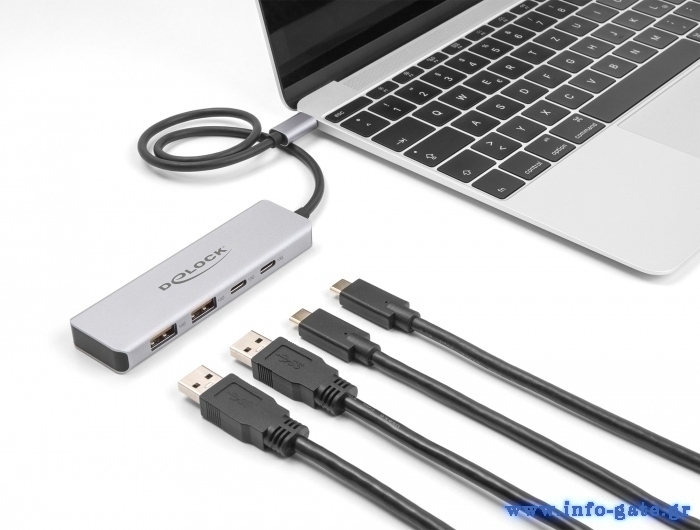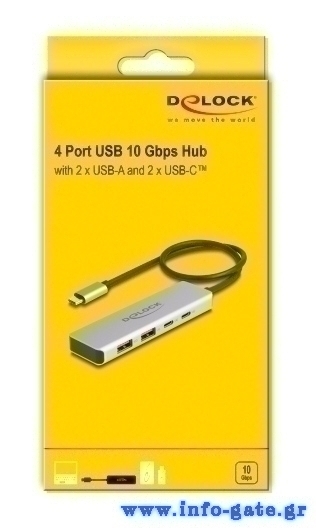 Αυτό το hub της Delock μπορεί να συνδεθεί με το laptop ή το desktop σας μέσω θύρας USB-C και να επεκτείνει τις θύρες του με 2x USB και 2x USB-C θύρες. Διαφορετικές συσκευές USB, όπως docking stations, card readers, εξωτερικοί HDD/SSD κλπ. μπορούν να συνδεθούν μέσω του hub.