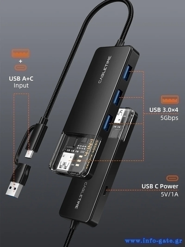 CABLETIME USB hub CT-HUBT3-PB, 4x θυρών, 5Gbps, USB/USB-C σύνδεση, μαύρο