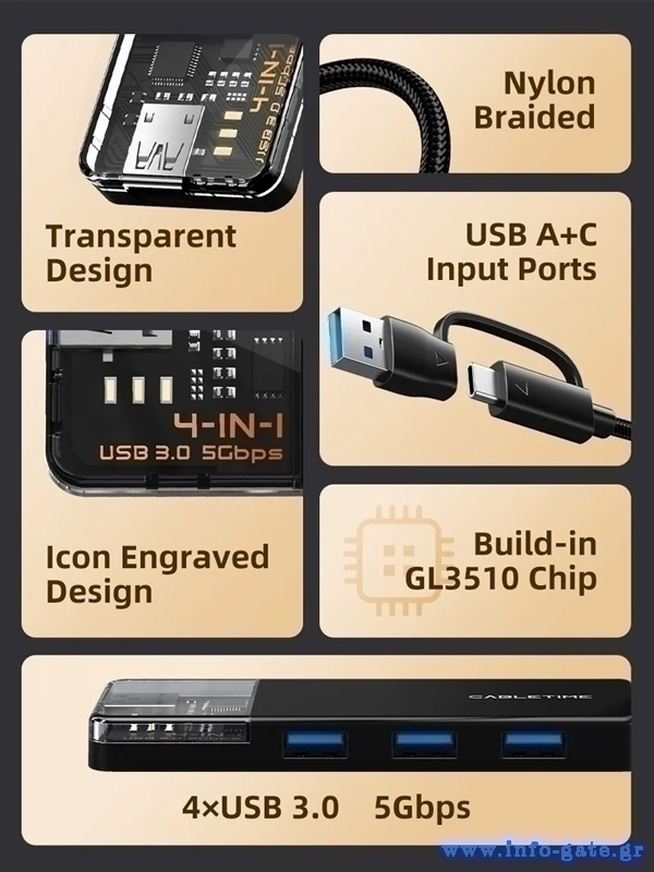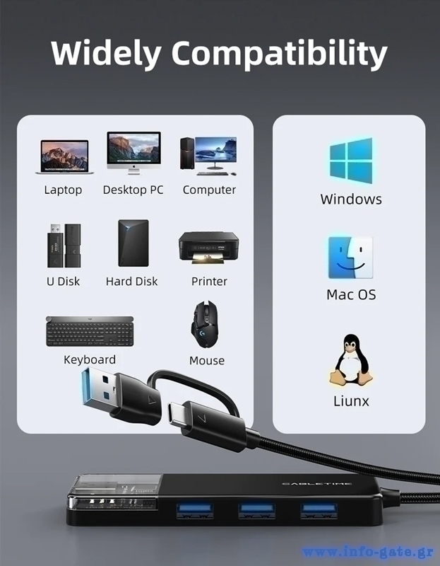 Το USB hub της Cabletime επεκτείνει τις θύρες του desktop ή laptop σας με 4x USB θύρες. Συνδέεται μέσω θύρας USB ή USB-C επιτρέποντας σας να συνδέσετε οποιαδήποτε συσκευή διαθέτει έξοδο USB, όπως σκληρούς δίσκους, ποντίκι, πληκτρολόγιο, web κάμερα, card reader κ.α.