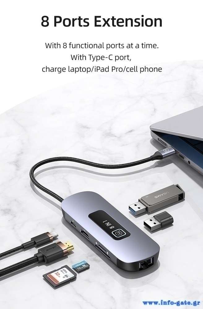USAMS docking station US-SJ643, 8 θυρών, USB-C, 4K, 100W PD, LAN, γκρι