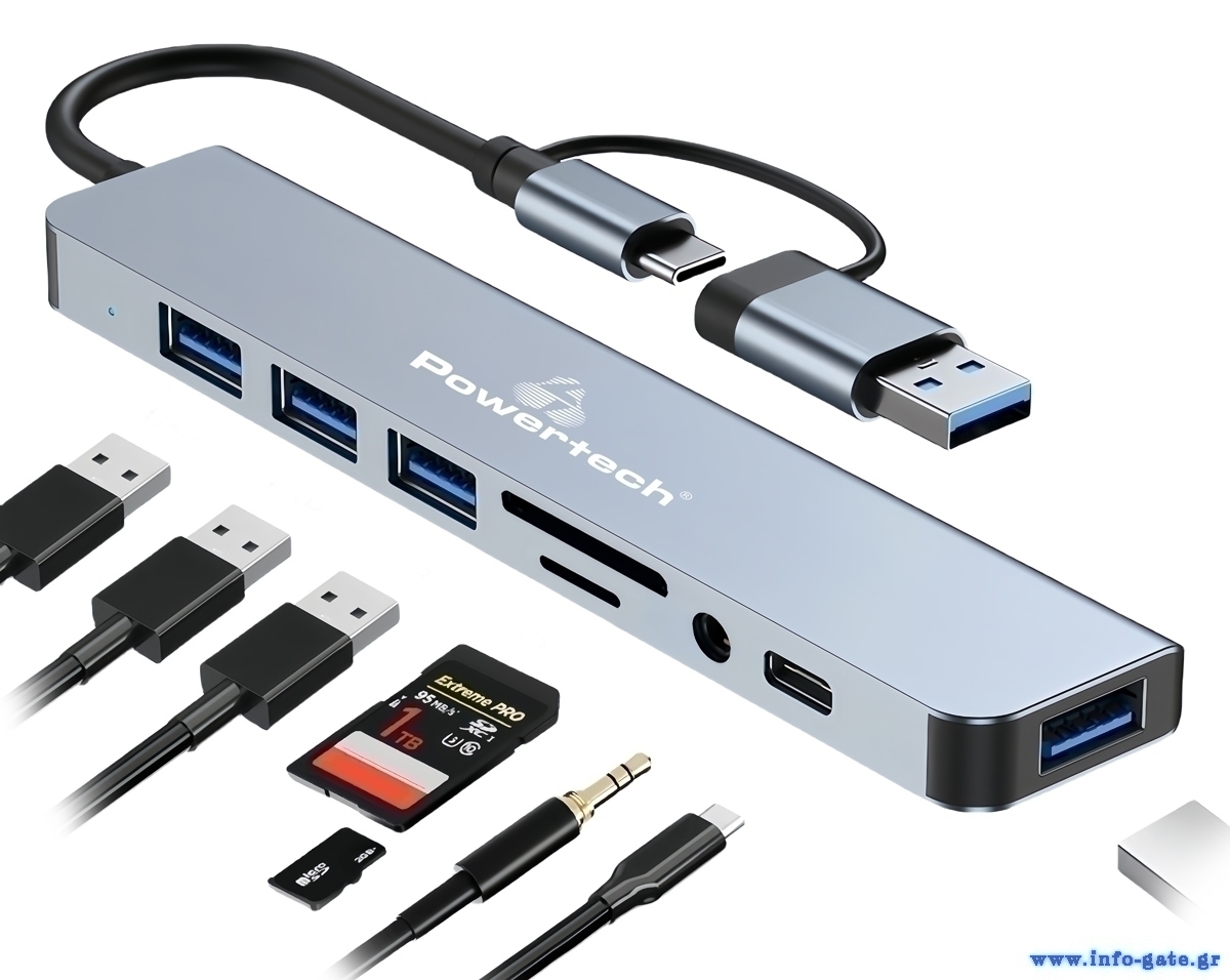 POWERTECH USB hub PTR-0151 με card reader, 8 θυρών, USB & USB-C, γκρι