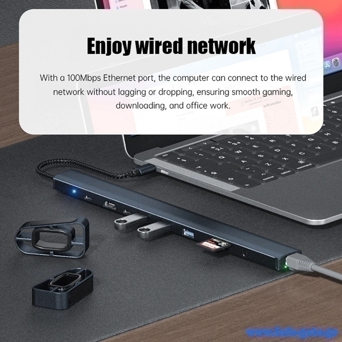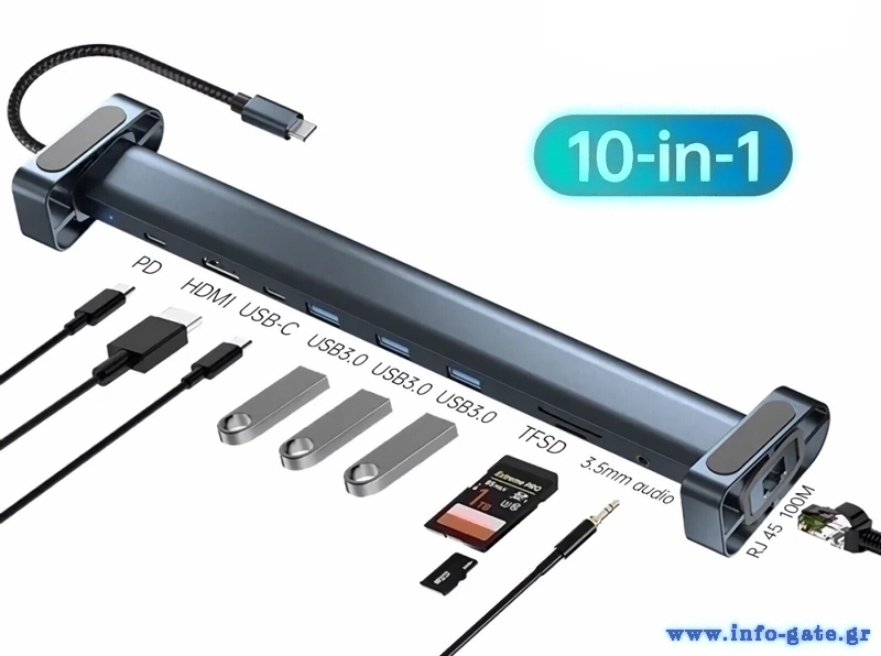 Μέσω της θύρας RJ45 σας επιτρέπει την ενσύρματη σύνδεση στο δίκτυο με ταχύτητες έως 100 Mbps ενώ μέσω της θύρας USB-C PD μπορείτε να φορτίσετε το laptop σας με απόδοση έως 100W.