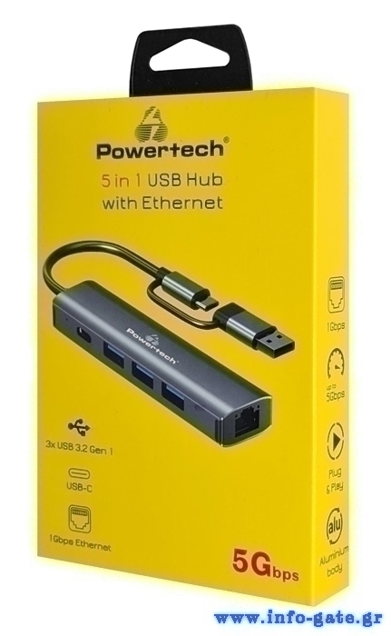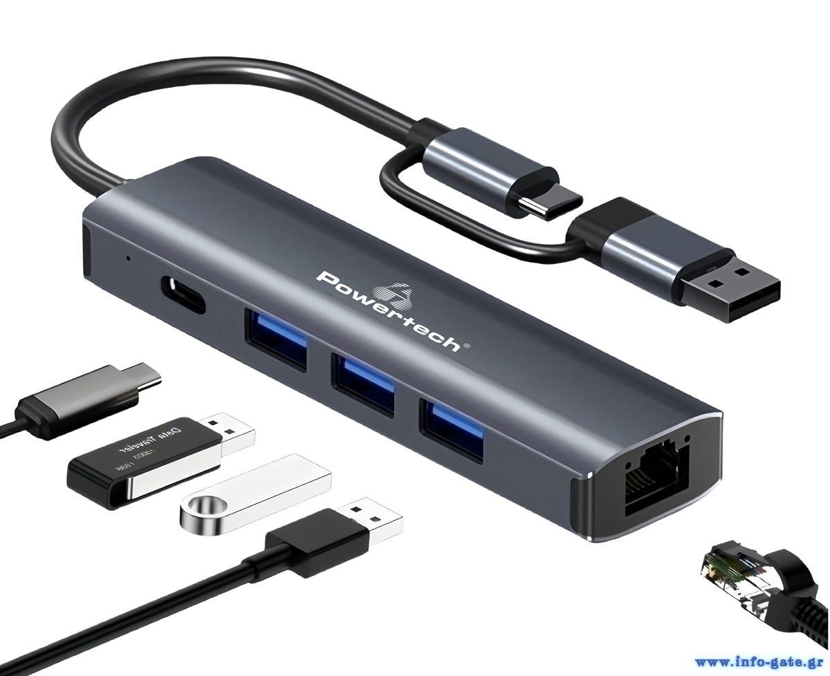 POWERTECH USB hub PTR-0150 με θύρα δικτύου, 4 θυρών, USB & USB-C, γκρι