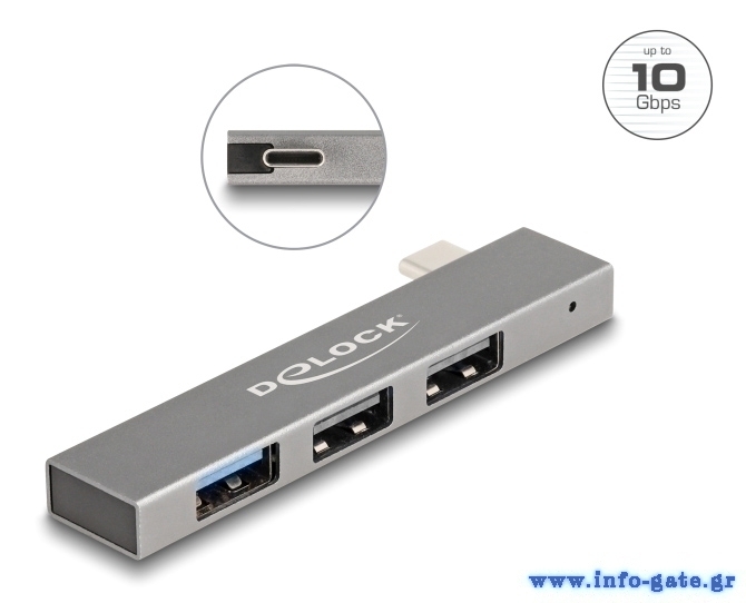 DELOCK USB hub 64274, 3x θυρών, 10Gbps, USB-C σύνδεση, γκρι
