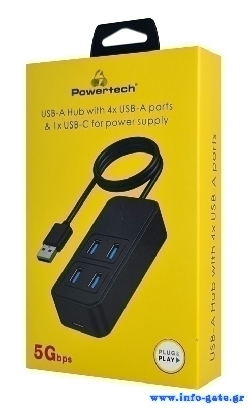 POWERTECH USB 3.2 hub PTR-0157, 4x θυρών, 5Gbps, USB σύνδεση, 1m, μαύρο