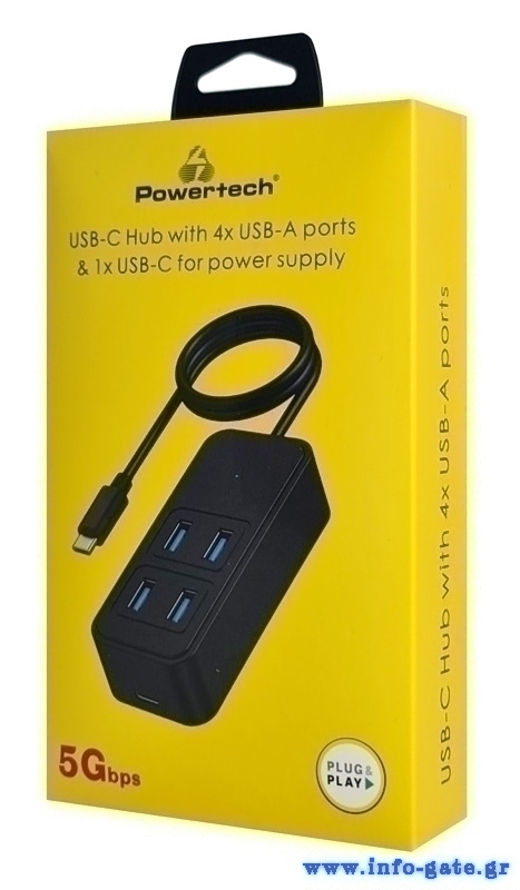 POWERTECH USB 3.2 hub PTR-0156 4x θυρών, 5Gbps, USB-C σύνδεση, 1m, μαύρο