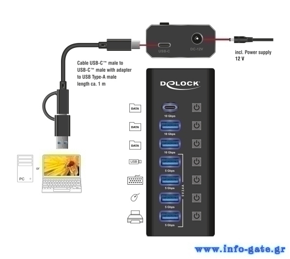 -θύρες: 2x USB (10Gbps), 1x USB-C (10Gbps), 4x USB (5Gbps, 5V/2.4A), 1x USB-C (σύνδεσης), DC jack 12V (έξτρα τροφοδοσία)
