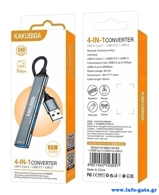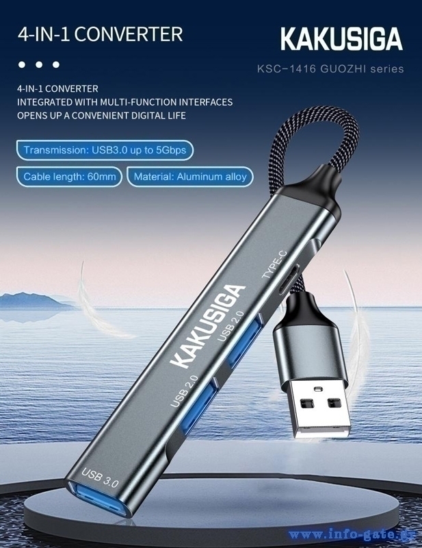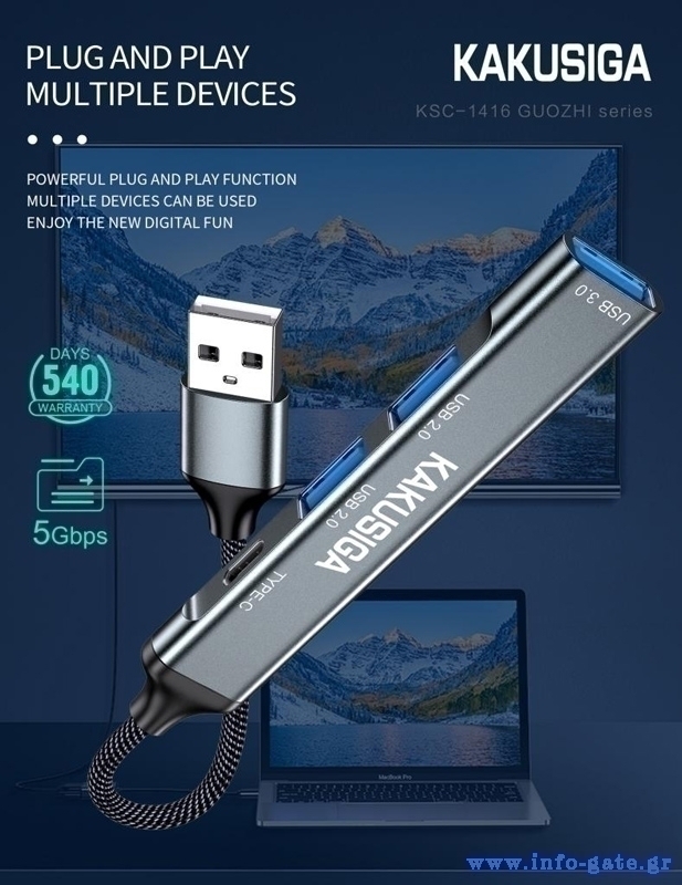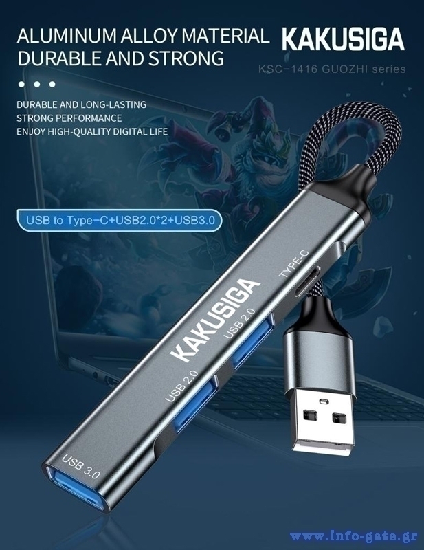 Αυτό το hub της KAKUSIGA μπορεί να συνδεθεί με το laptop ή το desktop σας μέσω θύρας USB και να επεκτείνει τις θύρες του με 1x USB-C και 3x USB θύρες. Διαφορετικές συσκευές USB, όπως εξωτερικοί σκληροί δίσκοι, card readers, ποντίκια κλπ. μπορούν να συνδεθούν μέσω του hub.