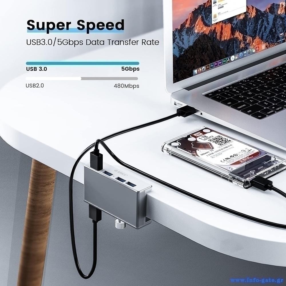 ORICO USB hub MH4PU-P με σφιγκτήρα, 4x θυρών, 5Gbps, USB σύνδεση, ασημί