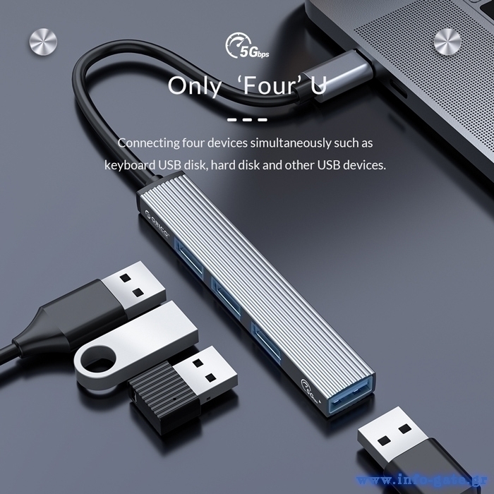 Αυτό το hub της ORICO μπορεί να συνδεθεί με το laptop ή το desktop σας μέσω θύρας USB-C και να επεκτείνει τις θύρες του με 4x USB θύρες. Διαφορετικές συσκευές USB, όπως εξωτερικοί σκληροί δίσκοι, card readers, ποντίκια κλπ. μπορούν να συνδεθούν μέσω του hub.