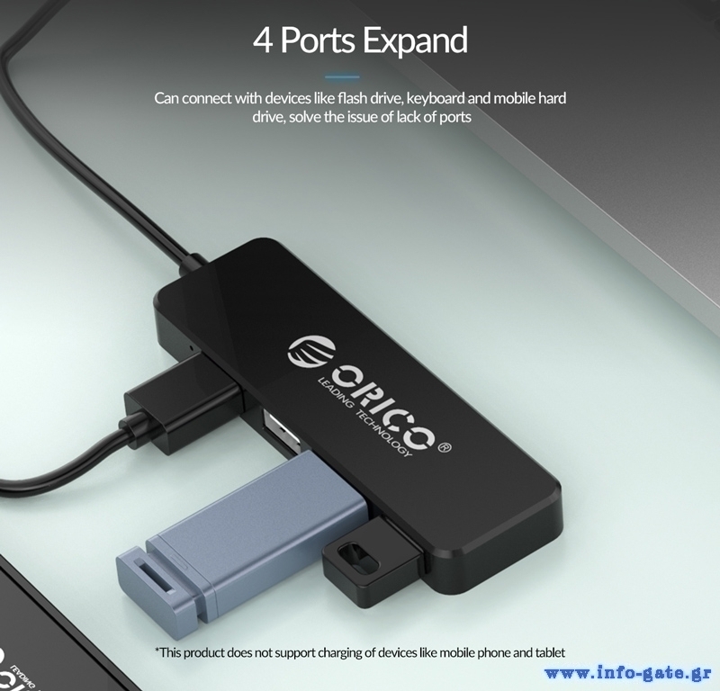 Αυτό το hub της ORICO μπορεί να συνδεθεί με το laptop ή το desktop σας μέσω θύρας USB και να επεκτείνει τις θύρες του με 4x USB θύρες. Διαφορετικές συσκευές USB, όπως εξωτερικοί σκληροί δίσκοι, card readers, ποντίκια κλπ. μπορούν να συνδεθούν μέσω του hub.