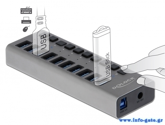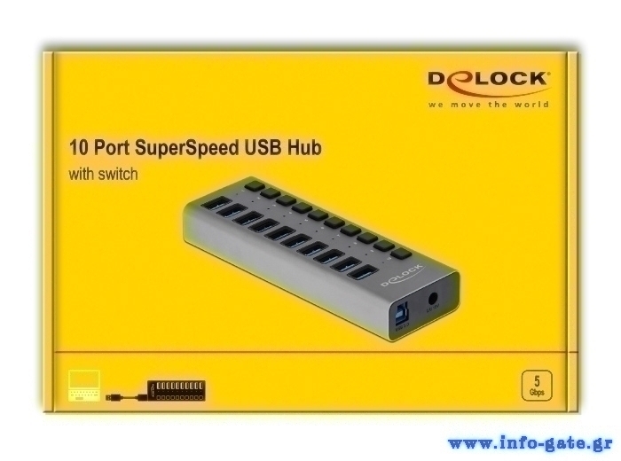 Το Hub USB 3.0 της Delock μπορεί να συνδεθεί με υπολογιστή μέσω καλωδίου USB επεκτείνοντας τον με 10 θύρες USB. Οι συνδεδεμένες συσκευές όπως τα smartphone μπορούν να φορτιστούν ή να μεταφέρουν δεδομένα στα 5 Gbps. Κάθε θύρα μπορεί να ενεργοποιηθεί ή να απενεργοποιηθεί ξεχωριστά χρησιμοποιώντας τους διακόπτες. Είναι ένα κομψό προϊόν υψηλής ποιότητας το οποίο είναι κατασκευασμένο από αλουμίνιο. Το design και η αίσθηση του μεταλλικού υλικού της κατασκευής δίνει ιδιαίτερο τόνο στο γραφείο σας, ταιριάζοντας αρμονικά με τις υπόλοιπες συσκευές σας.