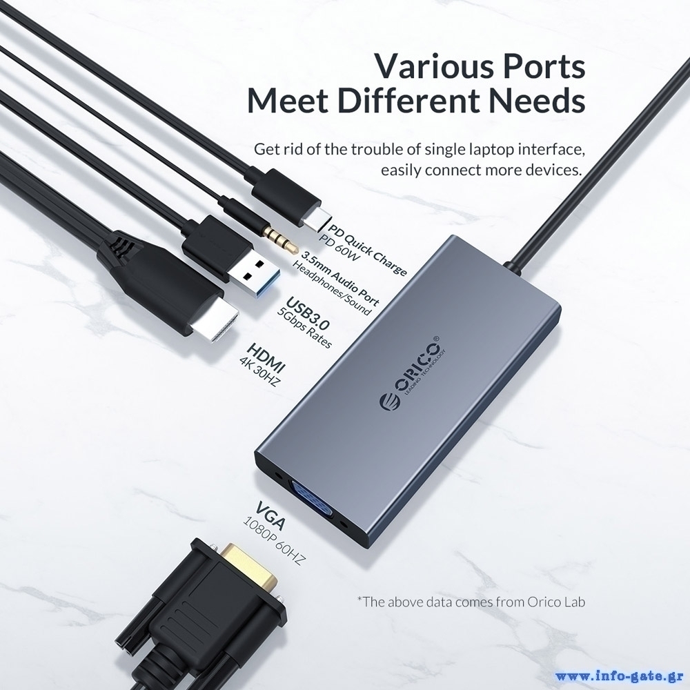 ORICO docking station MC-U501P, 5 θυρών, USB-C σύνδεση, 60W PD, 4K, γκρι