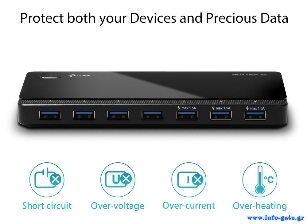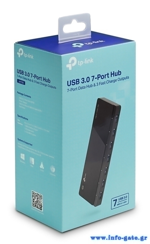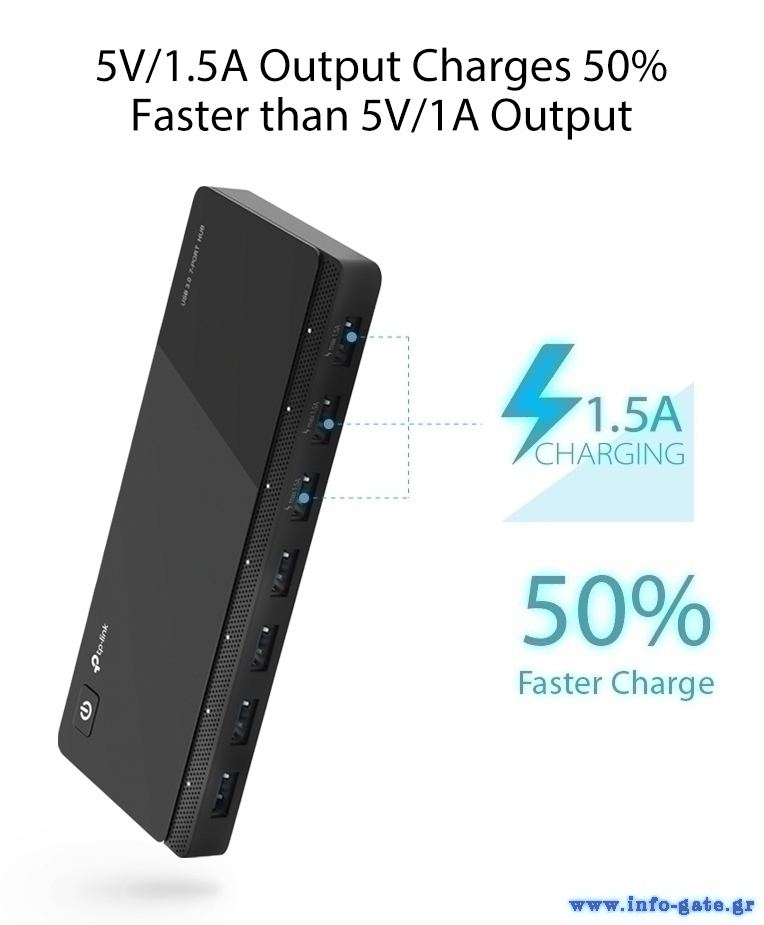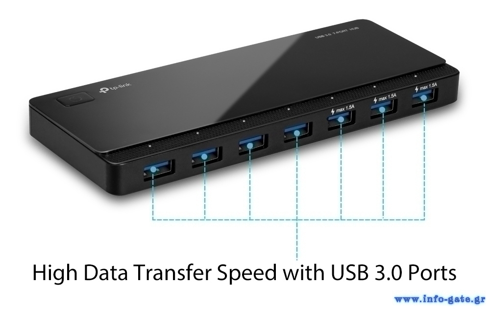 Το TP-LINK USB hub είναι η ιδανική επιλογή για να επεκτείνετε τις θύρες USB του υπολογιστή σας με 7 εξόδους USB 3.0 και ταχύτητα μεταφοράς έως 5Gbps. Διαθέτει 3 θύρες φόρτισης 5V/1.5A, που παρέχουν αρκετή τάση για όλα τα είδη φορητών συσκευών.