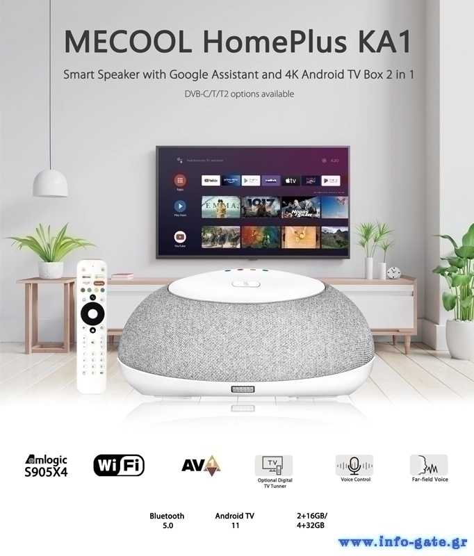 Το HomePlus KA1 από την Mecool είναι μια έξυπνη συσκευή που λειτουργεί ως TV Box, αποκωδικοποιητής και smart ηχείο, ενώ χάρη στα 2 ενσωματωμένα μικρόφωνα, υποστηρίζει τον έλεγχο των smart συσκευών σας μέσω φωνητικών εντολών.
