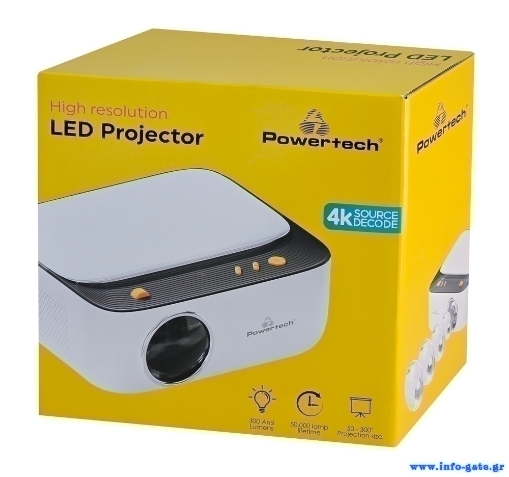 O LED βιντεοπροβολέας της Powertech προσφέρει μοναδικές δυνατότητες. Διαθέτει λυχνία LED με μεγάλη διάρκεια ζωής 50.000 ωρών και ισχυρό ενσωματωμένο ηχείο 3W. Μπορεί να προβάλει εικόνα μεγέθους έως 300" με φωτεινότητα 300 ANSI lumens και Full HD ανάλυση.
