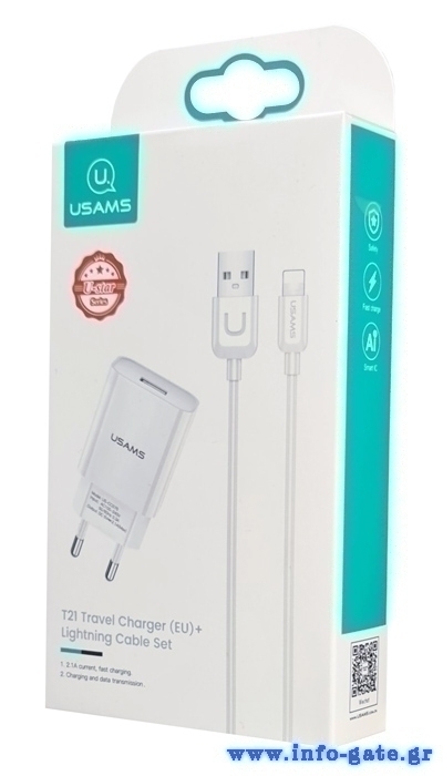 USAMS φορτιστής τοίχου T21OCLN01 με καλώδιο Lightning, USB 2.1A, λευκός