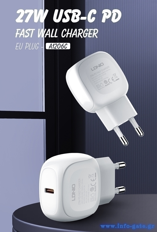 LDNIO φορτιστής τοίχου A1206C με καλώδιο USB-C, 1x USB-C, 27W PD, λευκός