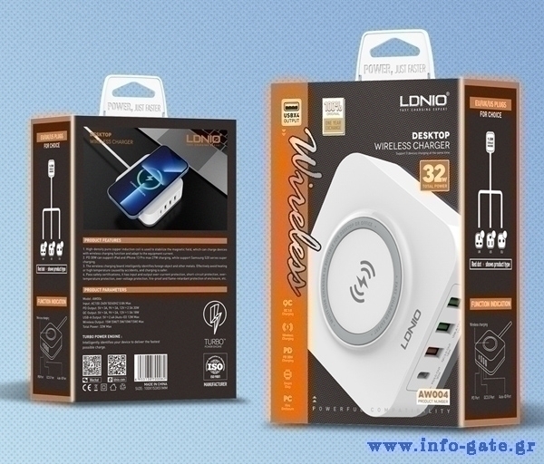 LDNIO σταθμός φόρτισης AW004, USB-C/3x USB/wireless, 32W, PD/QC, λευκός