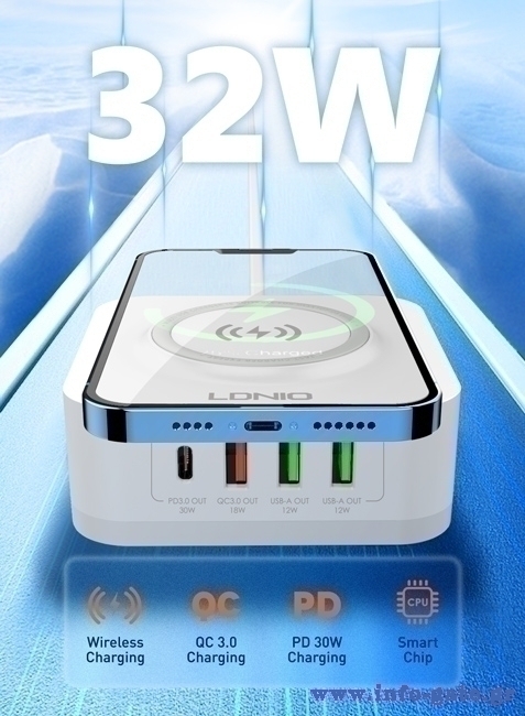 Διαθέτει 3x USB και 1x USB-C θύρες εξόδου που υποστηρίζουν φόρτιση με απόδοση έως 32W. Επιπλέον, υποστηρίζει ασύρματη φόρτιση με απόδοση έως 15W.