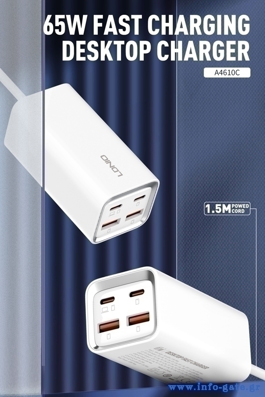 LDNIO σταθμός φόρτισης A4610C, 2x USB-C & 2x USB, 65W, PD/QC, λευκός