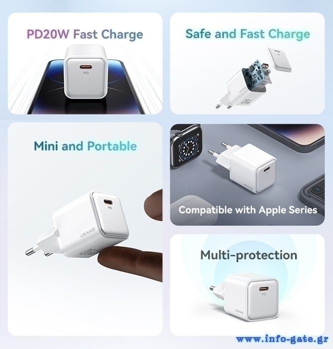 Υψηλής απόδοσης φορτιστής τοίχου της Usams, κατασκευασμένος από ανθεκτικό υλικό και συμβατός με συσκευές που φορτίζουν μέσω θύρας USB-C.