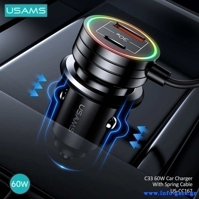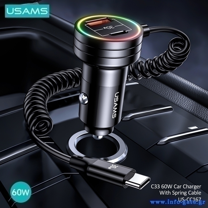 USAMS φορτιστής αυτοκινήτου US-CC167 με καλώδιο, USB/USB-C, 60W, μαύρος
