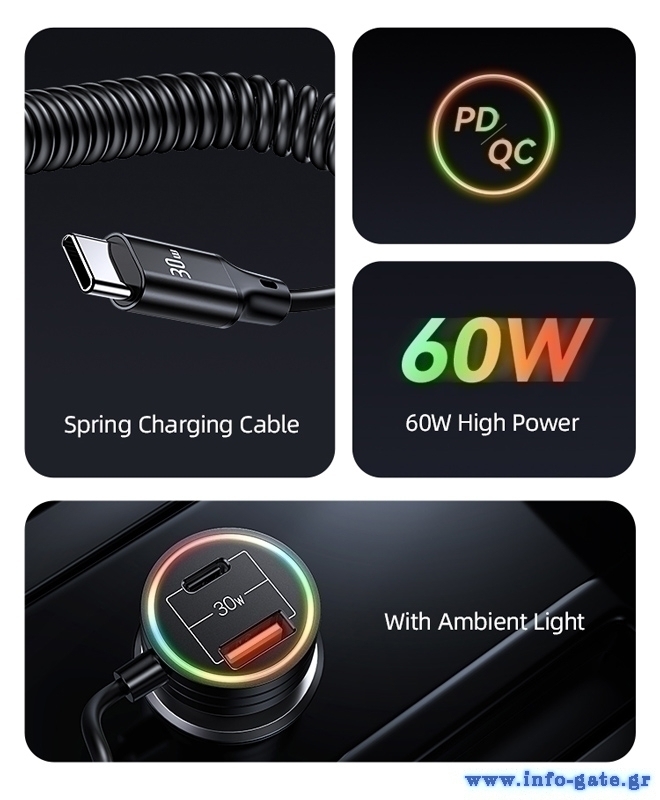 Διαθέτει 2x θύρες εξόδου (USB & USB-C) αλλά και ενσωματωμένο καλώδιο USB-C που υποστηρίζουν φόρτιση με μέγιστη συνολική απόδοση 60W.