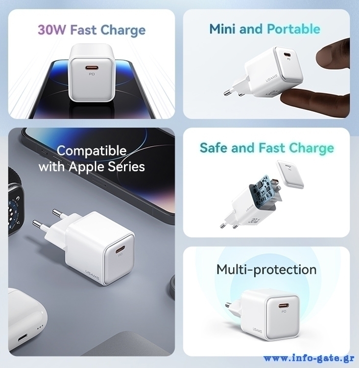 Υψηλής απόδοσης φορτιστής τοίχου της Usams, κατασκευασμένος από ανθεκτικό υλικό και συμβατός με συσκευές που φορτίζουν μέσω θύρας USB-C.