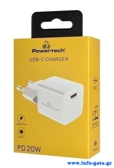 Υψηλής απόδοσης φορτιστής τοίχου της Powertech, κατασκευασμένος από ανθεκτικό υλικό και συμβατός με συσκευές που φορτίζουν μέσω θύρας USB-C. Διαθέτει 1x USB-C θύρα εξόδου που υποστηρίζει φόρτιση με απόδοση έως 20W.