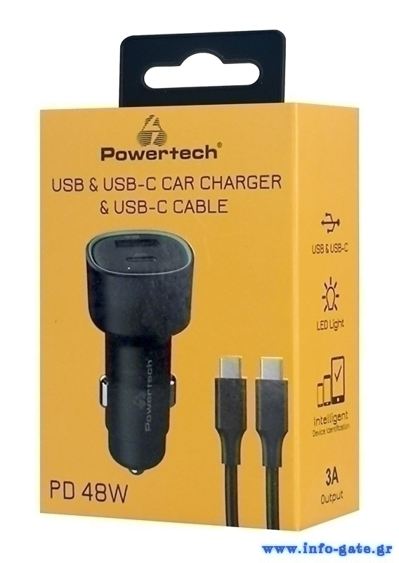 POWERTECH φορτιστής αυτοκινήτου PT-1230, καλώδιο, USB/USB-C, 48W, μαύρος